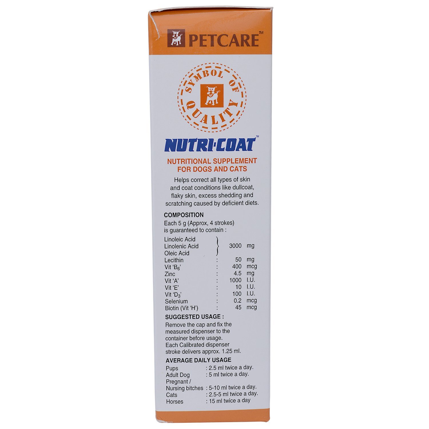 Nutricoat, the leading brand among skin supplements, provides essential fatty acids such as Linoleic (Omega 6) and Linolenic (Omega 3) acids, useful for maintaining skin health. Other vital nutrients like biotin, Zinc, selenium, vitamins A, D3 and E supplement the action of essential fatty acids in maintaining the skin and coat condition. Can be used in case of Dry, lusterless hair and alopecia, Scaly nutritional dermatoses and dandruff, Hyperkeratosis and spectacular eye, Allergic dermatitis and pruritus and to improve immune status of skin. The tonic maintains healthy skin and metabolism in dogs, provides essential fatty acids such as linoleic (omega 6) and linolenic (omega 3), also useful for maintaining coat.